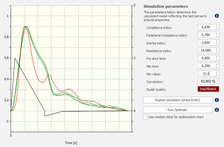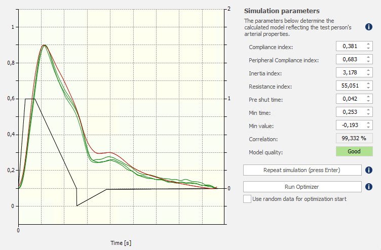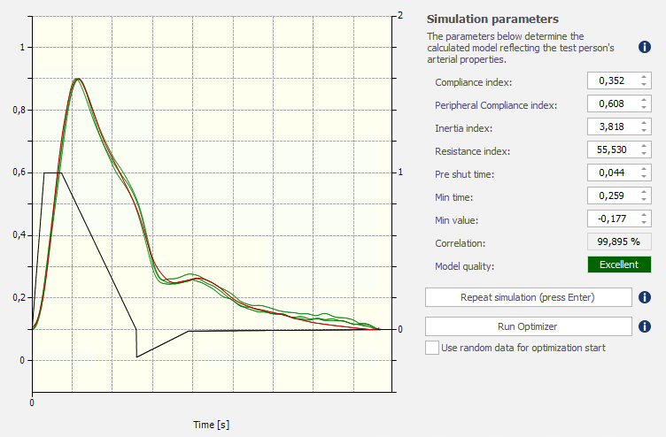 Der abschließende Schritt war die Entwicklung einer Rechenvorschrift, die unsere acht Modellparameter so anpasste, dass wir am Ende das Abbild des arteriellen Kreislaufsystems einer realen Person erhielten. Der Daten-‘Output’ sieht im Ergebnis so aus: Der optimierte Modellparametersatz sowie die erreichte Simulationsqualität sind über die Software unmissverständlich in Prozentzahlen ablesbar. In ‚schlecht‘ simulierten Fällen erreicht die Qualität eine Genauigkeit von 97%, häufig 99,5%, aber durchaus auch 99,9%. Bei 100% läge eine vollkommene Übereinstimmung von Simulation und Realität vor.