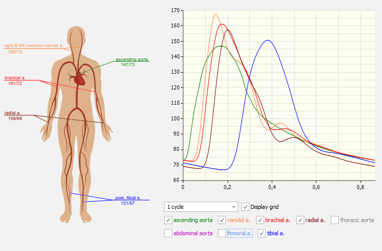 Die individuellen Gefäßdaten des Patienten und damit auch die spezifischen physikalischen Wandeigenschaften sind auf Basis des während der Berechnung erstellten Arterienbaummodells nun auf einen Blick ablesbar. Und zwar in genau derselben Detailtiefe, als hätte man direkt in die Arterien geblickt: Über eine angeschlossene Software lassen sich die aufgezeichneten Pulswellen auf einen Desktop oder ein Notebook übertragen und visualisieren. Dort sind sie bis ins Detail analysierbar. Schon früheste Gefäßveränderungen lassen sich aufspüren — durch idealerweise schnell einsetzende Interventionen kann man in vielen Fällen ernste Komplikationen vermeiden. Viele Herz-und Gefäßerkrankungen ‘verraten’ sich während der softwaregestützten Visualisierung über markante Abweichungen gegenüber der ’normalen’, also gesunden, Pulskurvenform.